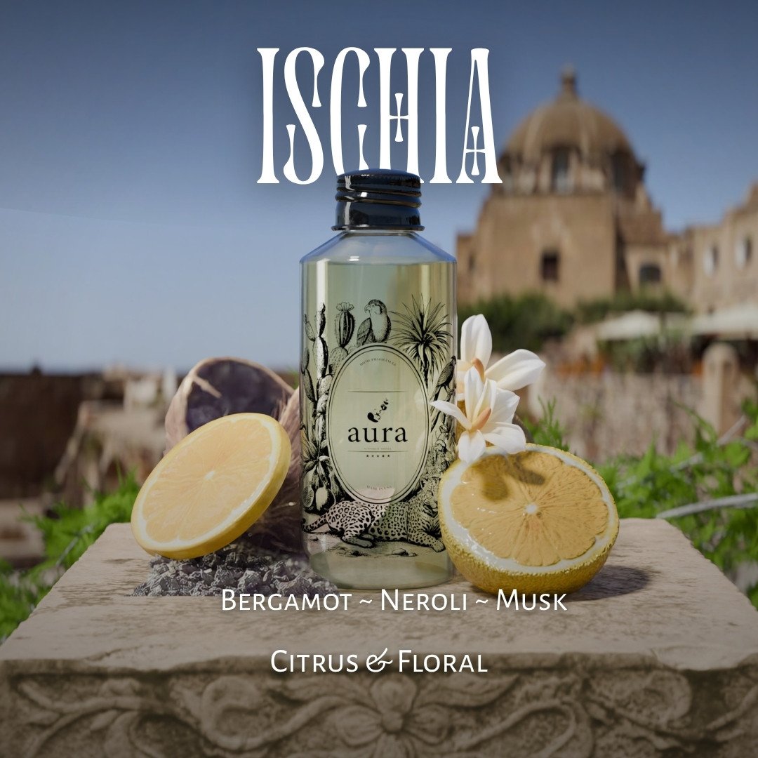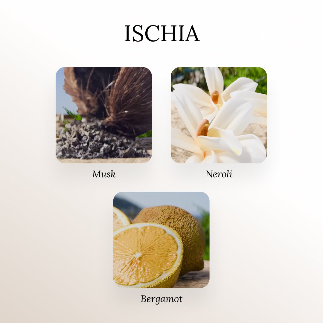Ischia is a vibrant and invigorating fragrance that captures the essence of the Italian Riviera. This scent is a masterful blend of citrus and floral notes, designed to evoke the feeling of a sun-soaked day on the Mediterranean coast. The fragrance opens with a sparkling burst of citrus, featuring the bright and zesty notes of bergamot, lemon, mandarin, and bitter orange. These top notes are complemented by the green and refreshing nuances of lavender and rosemary, creating an immediate sense of freshness and vitality. Olfactive Family:Â Citrus & Floral