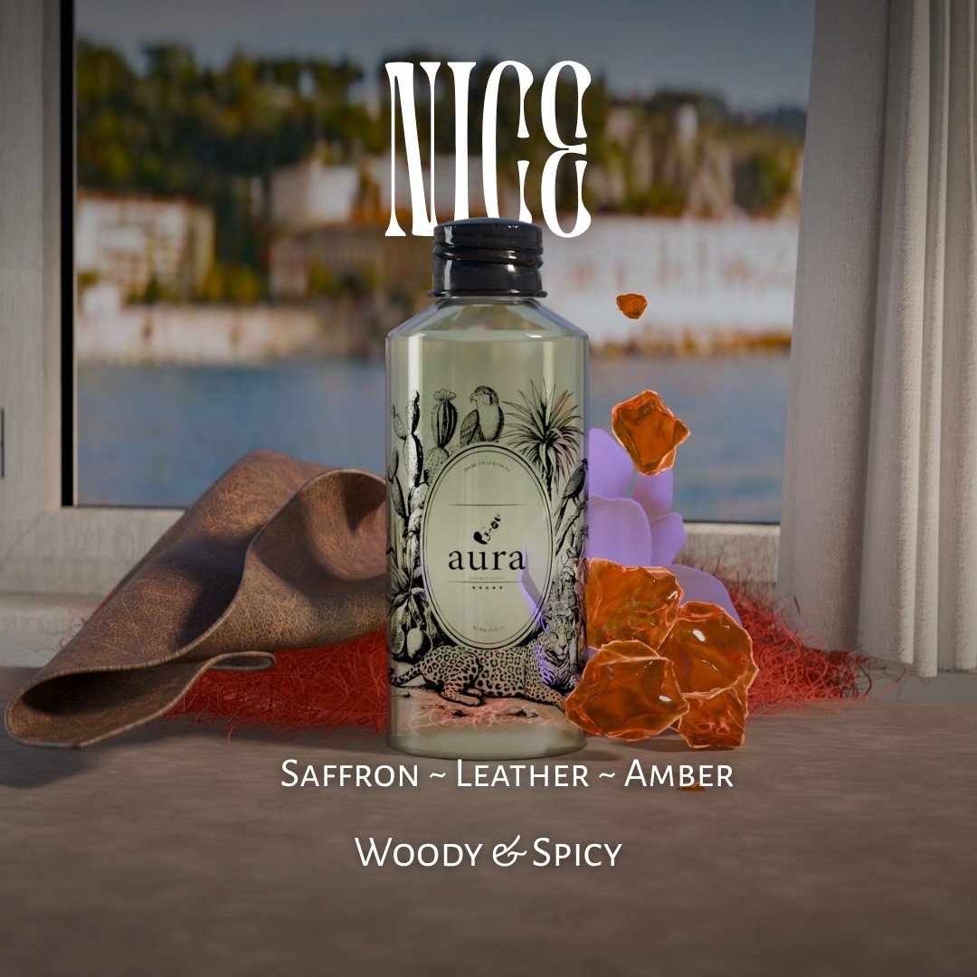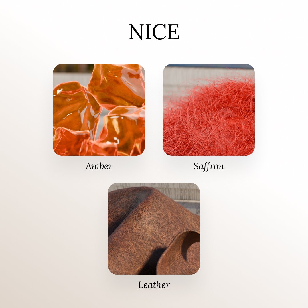 Nice is an exquisite fragrance that captures the rich, opulent essence of saffron, balanced by floral and woody notes to create a sophisticated and multifaceted scent. This luxurious perfume opens with a vibrant blend of juniper berries and saffron, introducing a spicy, aromatic start that immediately captivates the senses. At the heart, the fragrance reveals a bouquet of velvety roses, which add a touch of floral elegance, complemented by the powdery sweetness of violet. These floral notes intertwine beautifully with the initial spiciness, creating a harmonious and intriguing middle phase.